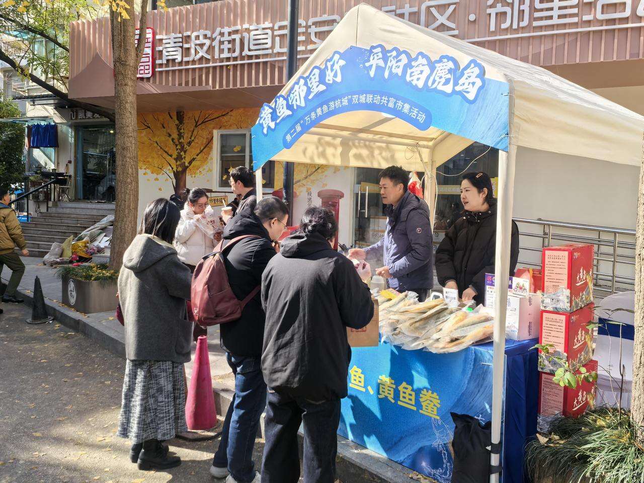 现场共设置了11个展位,集中展销南麂大黄鱼、黄鱼酥、饭糍、蜂蜜等平阳特色农产品,这次活动不仅将国家级海洋自然保护区南麂列岛的鲜美直接送到了杭城市民的家门口,更是在银杏摇曳的街区,搭起了一座连接山海、温暖邻里的“共富桥梁”。