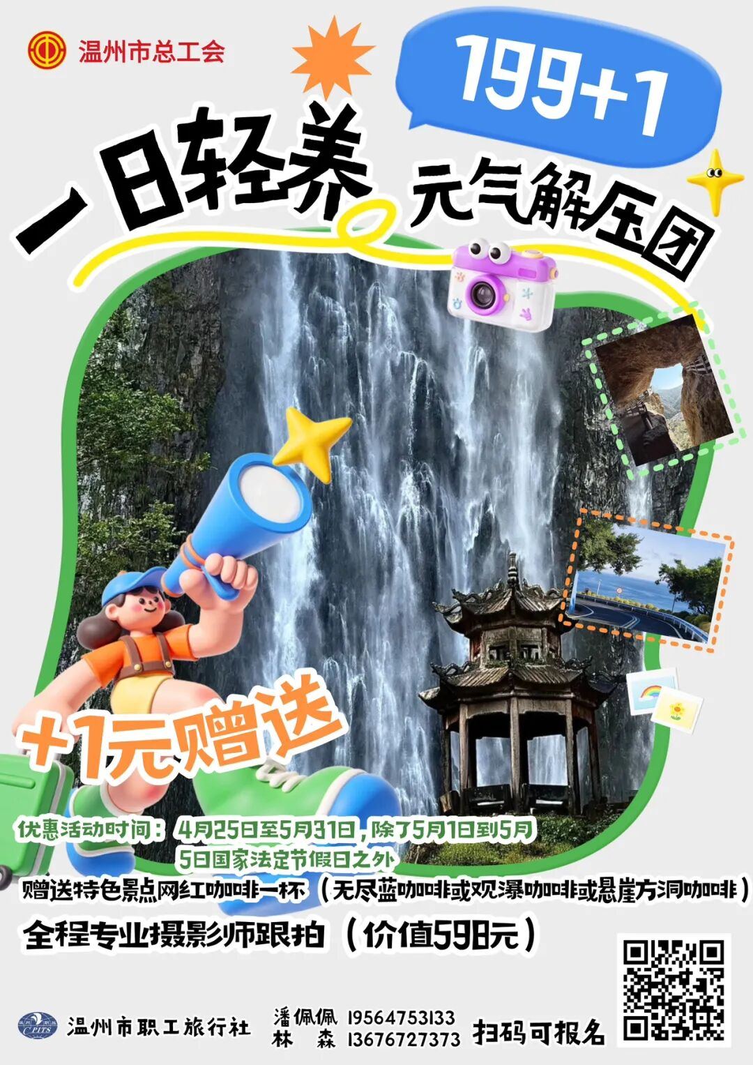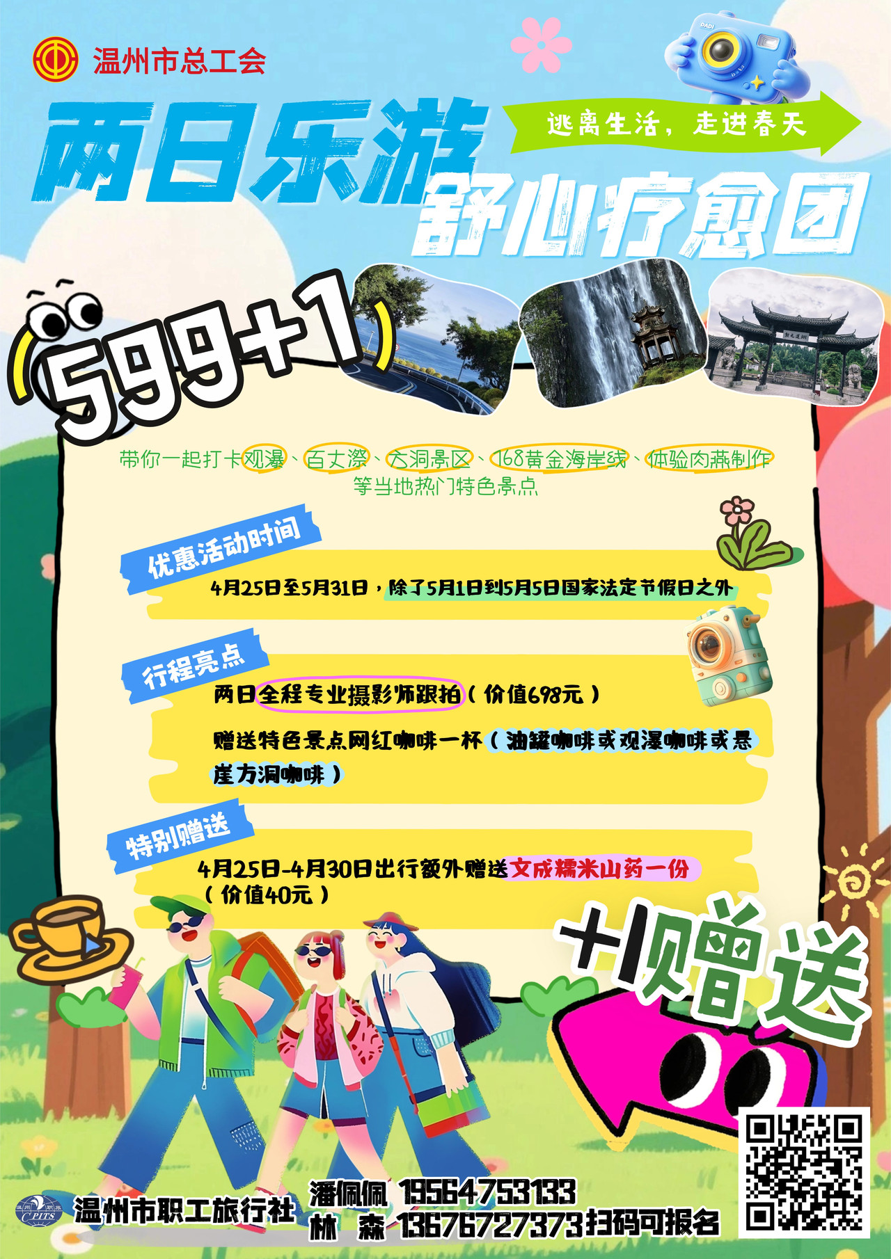 2、报名方式:可通过各线路下方二维码小程序进行报名,同时也可通过4月25日园博园和阅市集活动现场在温州市职工旅行社摊位线下进行了解报名。相关具体事宜可联系温州市职工旅行社:潘佩佩19564753133;林森13676727373。