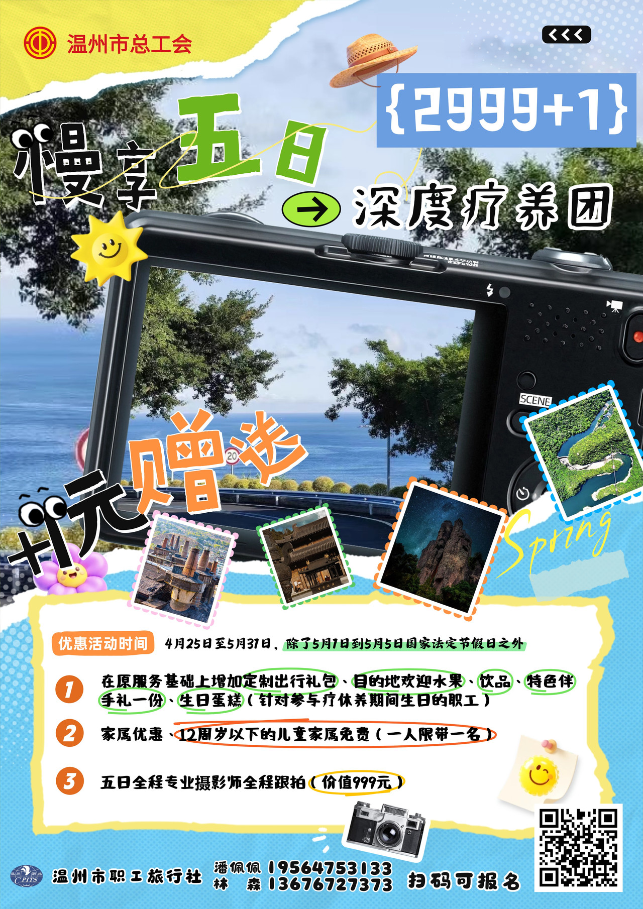 (浙江在线 4月22日讯 通讯员 邵晨晨 )春光正好,来场疗愈之旅。近日,温州市职工旅行社为全市职工的“春秋游+疗休养”量身定制了三种贴心价位,多条精选市域线路在此基础上,只需多一元,就可以享受额外叠加的增值项目。